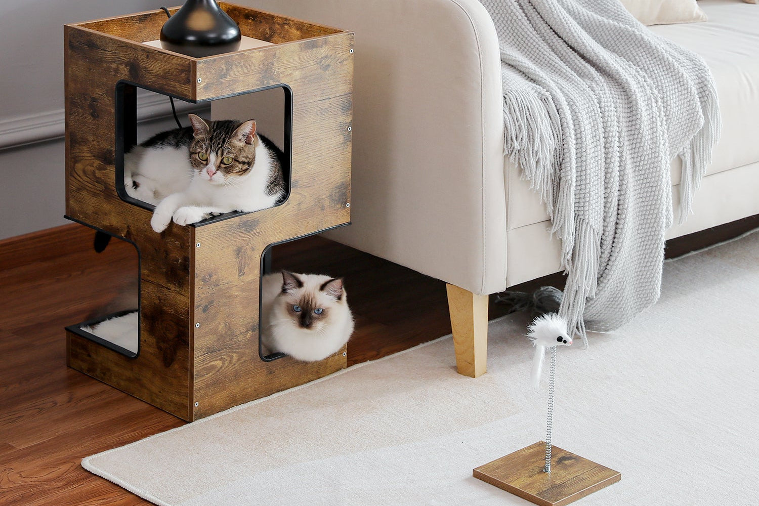 Sollicite ses instincts sans détruire votre intérieur Grimper, se cacher, observer, gratter : tous ses besoins naturels sont comblés sur un seul meuble élégant qui sublime votre salon.
