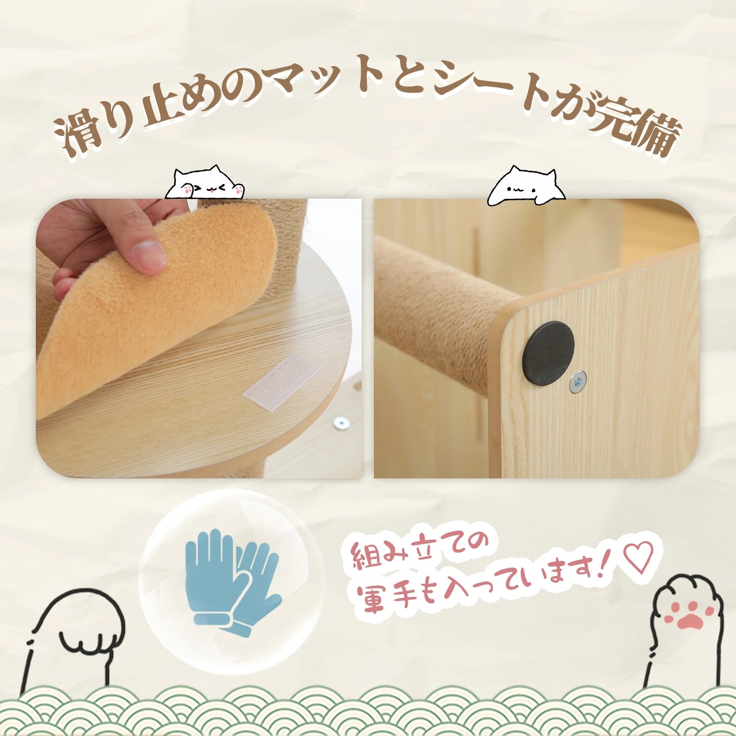 Les poteaux sont entièrement enveloppés de corde en sisal naturel afin de répartir les surfaces de griffade sur toute la hauteur. Plusieurs plateformes intermédiaires permettent une progression verticale par paliers. La niche cubique centrale intègre un coussin intérieur. Les plateformes sont équipées de tapis antidérapants amovibles. Des patins et éléments antidérapants sont prévus pour limiter les déplacements. Les angles sont arrondis afin de réduire les zones saillantes. Une sangle murale est incluse pour renforcer la stabilité si nécessaire.