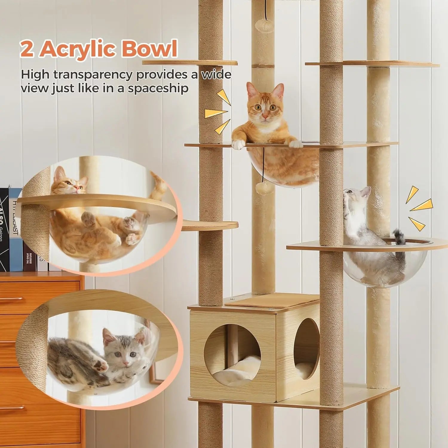L’arbre à chat bois avec plusieurs plateformes, tour d'observation et poteaux griffoir – Lirona adopte une structure verticale sur 6 niveaux conçue pour exploiter la hauteur. Sa base carrée de 54 cm assure un appui stable, tandis que les poteaux porteurs sont répartis sur toute la structure afin de soutenir les différentes plateformes. Deux paniers transparents en acrylique intégrés aux étages intermédiaires, plusieurs paliers de transition ainsi qu’une plateforme supérieure rembourrée servant de zone d’observation.