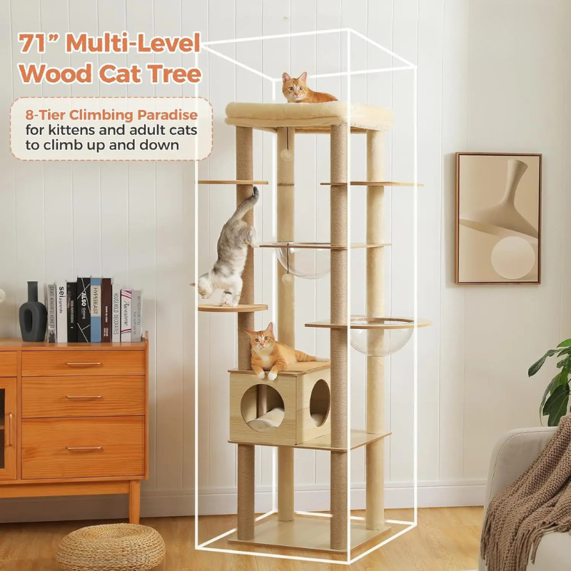 Un arbre à chat bois beige de 180 cm avec 6 niveaux, deux paniers transparents et plateforme d’observation supérieure