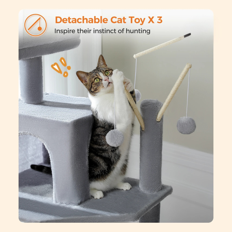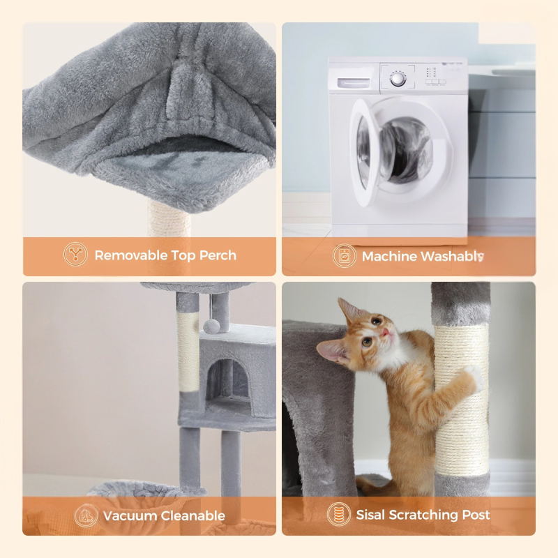 L’arbre à chat intègre plusieurs surfaces horizontales positionnées à différentes hauteurs afin de faciliter les déplacements verticaux. Les paniers suspendus offrent des positions semi-enveloppantes, tandis que la niche inférieure forme un espace fermé. Le niveau supérieur dispose d’un couchage avec rebords. Les 5 poteaux à griffer en sisal sont répartis sur la hauteur pour permettre l’étirement. Des balles suspendues complètent l’ensemble pour favoriser l’interaction.